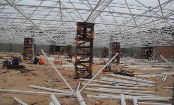 5)总体晋职法:此步履多使用在周边支护以及有多点支护的网架结构,可采取平板升降机、液压千斤顶等小型机具作业江北施工;